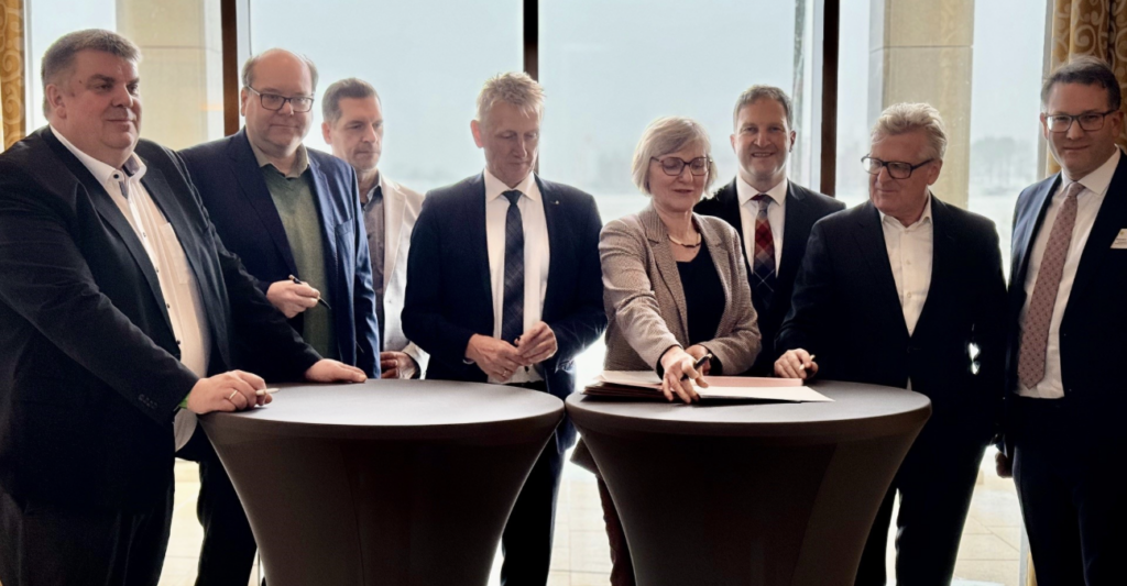 Wilhelmshaven/Wangerland (7. 2. 2026) – Nach jahrelangem Vorlauf könnte jetzt der finale Knoten für den Bau des Trilateralen Weltnaturerbe-Wattenmeer-Partnerschaftszentrum (TWWP) am Banter See in Wilhelmshaven durchschlagen worden sein. Am Rande des Festaktes zum 40-jährigen Bestehens des Nationalpark Niedersächsisches Wattenmeer am Freitag haben Petra Burmeister und Tim Menke vom städtischen Eigenbetrieb GGS, Peter Südbeck von der Nationalparkverwaltung Niedersächsisches Wattenmeer und Sascha Klöpper vom Gemeinsamen Wattenmeersekretariat die ersten Mietverträge unterschrieben.