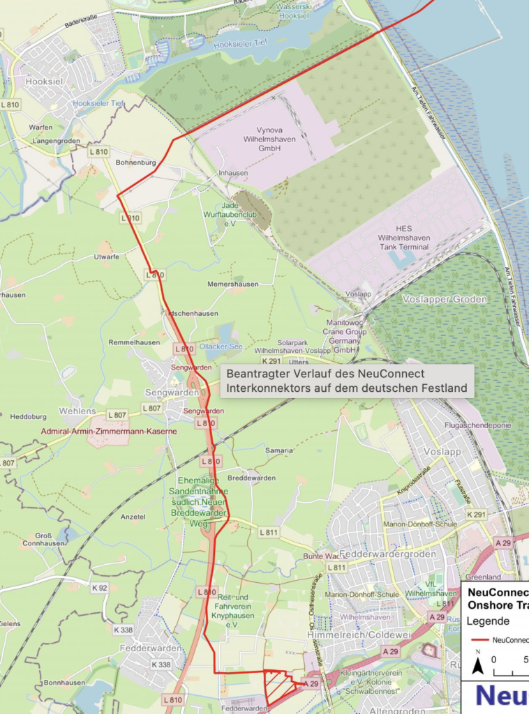 Entlang der Landesstraße 810 zwischen Hooksiel und Sengwarden sind derzeit etliche (niederländische) Bagger dabei, in „Deutschland-Geschwindigkeit“ die Trasse für ein Erdkabel zu buddeln, das den Anlandepunkt des Seekabels – südlich des Hooksieler Außenhafens – mit der im Bau befindlichen, riesigen Konverterstation in Wilhelmshaven-Fedderwarden (direkt an der A 29) verbinden soll. Für die Dauer der Arbeiten sind entlang der L 810 (siehe Grafik von NeuConnect) zum Schutz der Baustellenzufahrten mehrere Tempo-50-Zonen eingerichtet worden. Vorsicht: Hier wird auch geblitzt!
