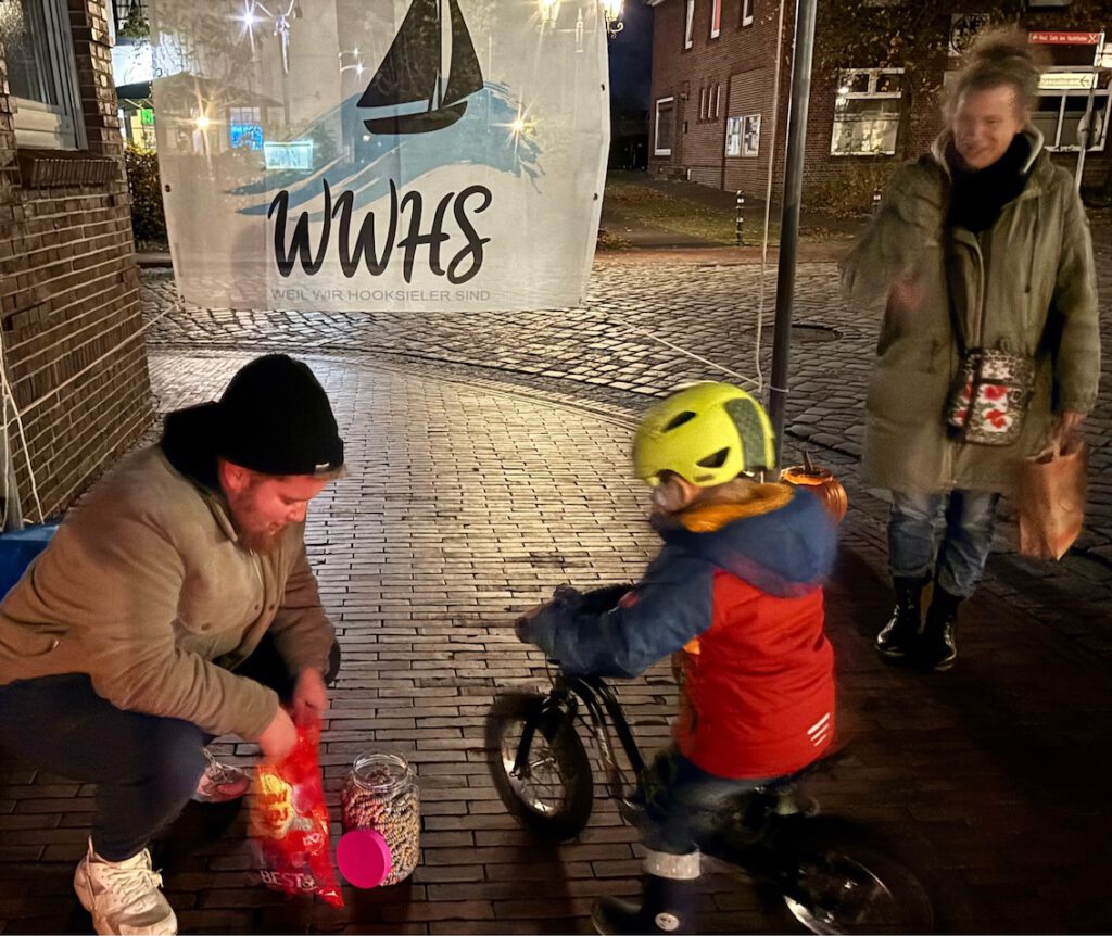 Zu Halloween gehören traditionell auch beleuchtete Kürbisfratzen. Davon hatte die Initiative Weil wir Hooksieler sind (WWHS) in der Lange Straße eine ganze Reihe aufgestellt. Aufgabe der vorbei ziehenden Kindergruppen war es, deren genaue Zahl, nämlich 36, zu bestimmen. Als Belohnung verteilten Julian Dreßel und seine Mitstreiter – natürlich – Süßes und Saures.