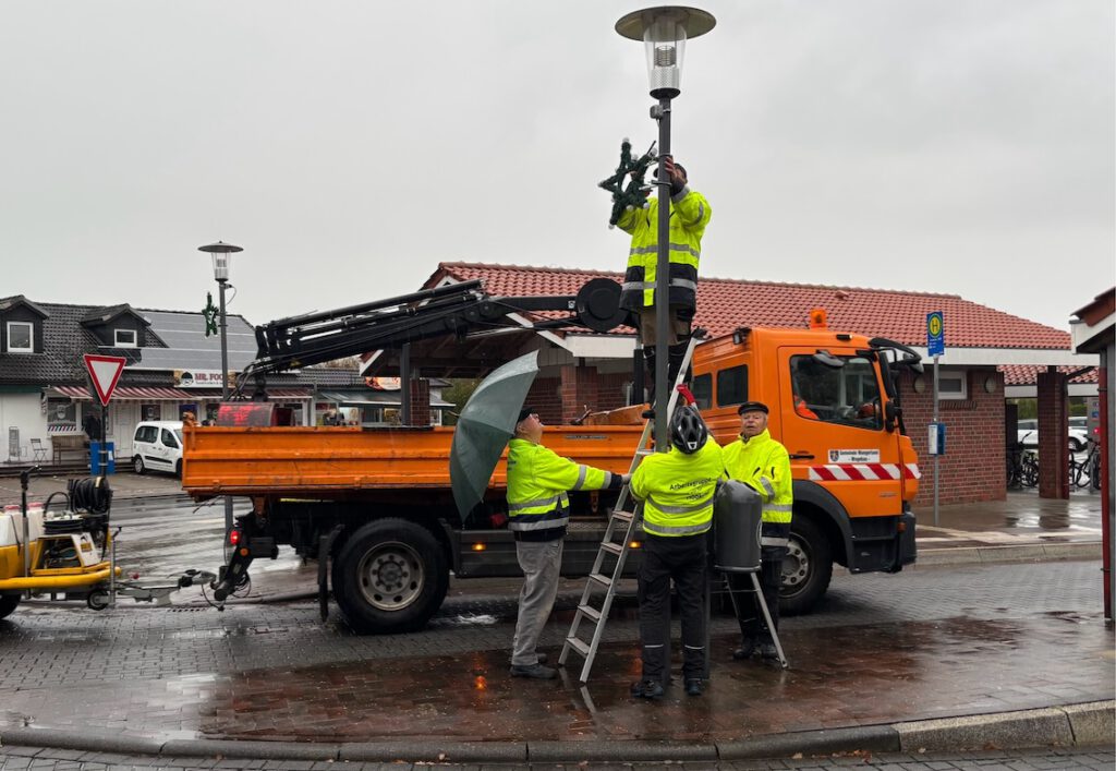 Hooksiel (20. 11. 2025) – Hooksiel strahlt. Dank des Einsatzes der Arbeitsgruppe Hooksiel leuchten seit diesem Mittwoch wieder 66 Weihnachtssterne an den Straßenlaternen im Ort. Im Rahmen von drei Arbeitsdiensten haben die ehrenamtlichen Kräfte den Weihnachtsschmuck entlang der Hooksieler Verkehrsachse vom Sengwarder Anteil über Lange Straße, Nee Straat und Pakenser Altendeich bis Schmidtshörn montiert. Geschmückt wurden zudem die Fußgängerzone und das Areal rund um den Alten Hafen.