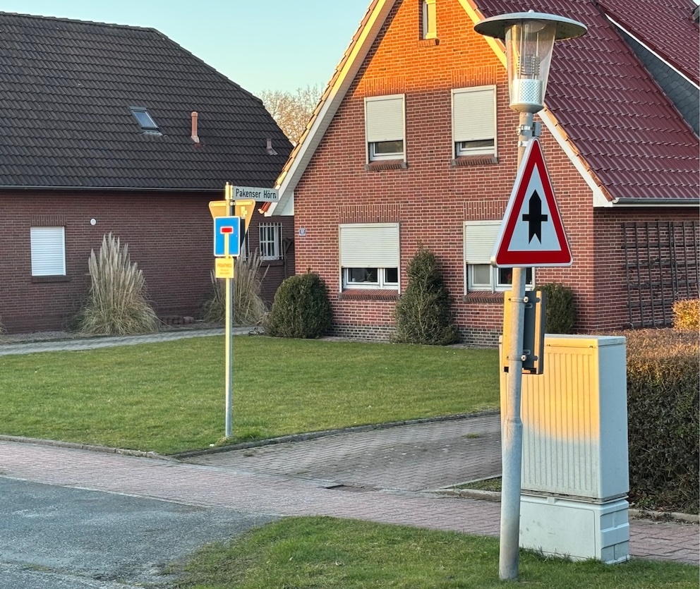 An der Nordstraße, die unter anderem zur katholischen Kirche führt, erfüllt das Schild seither seinen Zweck. Das zweite Schild allerdings war seinerzeit irrtümlich an der Einmündung der Ludwig-Meinardus-Straße aufgehängt worden – etwa 100 Meter vom Pakenser Hörn entfernt. Hier allerdings ergab die Beschilderung überhaupt keinen Sinn. Die Ludwig-Meinardus-Straße ist als „Verkehrsberuhigter Bereich“ (im Volksmund: Spielstraße) ausgeschildert. Verkehrsteilnehmer, die sich aus einem solchen Bereichen ins Straßennetz einfädeln wollen, haben nie Vorfahrt. Sie müssen sich so verhalten, als würden sie von einem Privatgrundstück auf eine Straße fahren.
