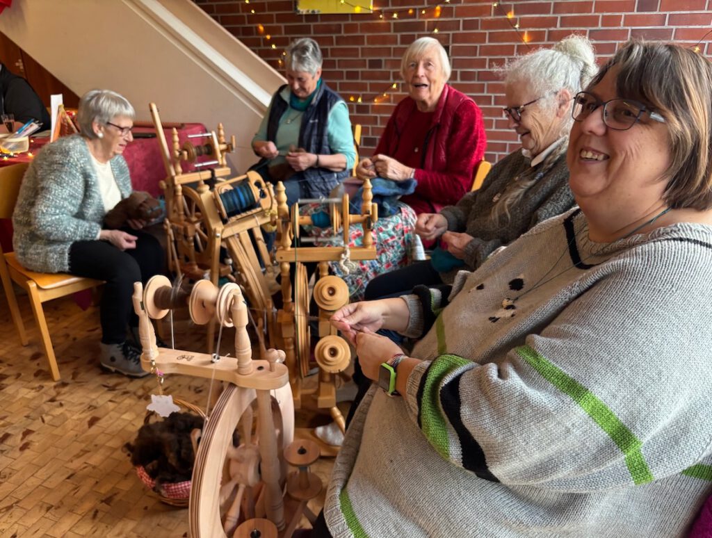Das Gemeindehaus der evangelisch-lutherischen Kirchengemeinde mitten im Ort ist Treffpunkt für etliche Gruppen aus Hooksiel. Neben Frauen- und Männerkreis, Chören, Spinnerinnen und vielen weiteren Aktivrunden trifft sich eine Kreativgruppe hier regelmäßig. Entsprechend bunt war das Angebot auf dem Adventsmarkt. Damen an Spinnräder führten vor, wie sich aus unterschiedlichen Schafsfellen Wolle herstellen lässt – und was man daraus machen kann. Conny Anders bot neben von ihr in Hooksiel gemalten Bildern eine Fülle adventlicher Gestecke und Kränze an.