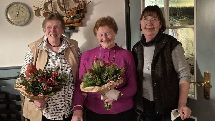 Erfreulicher Höhepunkt der Hauptversammlung war die Ehrung langjähriger Mitglieder. So überreichte Anne Frerichs ihren Mitstreiterinnen Margret Harken und Margot Broeren für 50-jährige Mitgliedenschaft Blumensträuße. Margot Broeren war seit ihrem Eintritt in den Landfrauenverein dessen Schriftführerin und soll – so wird berichtet – seitdem nicht eine einzige Veranstaltung verpasst haben.