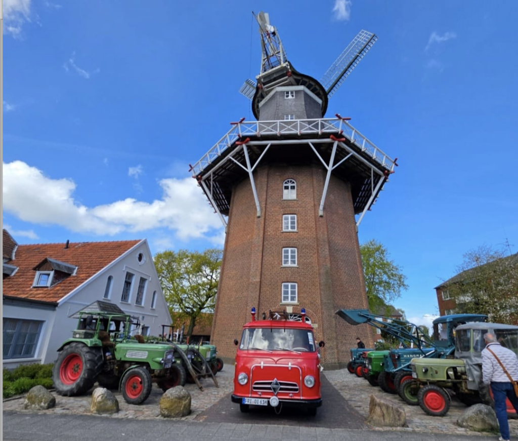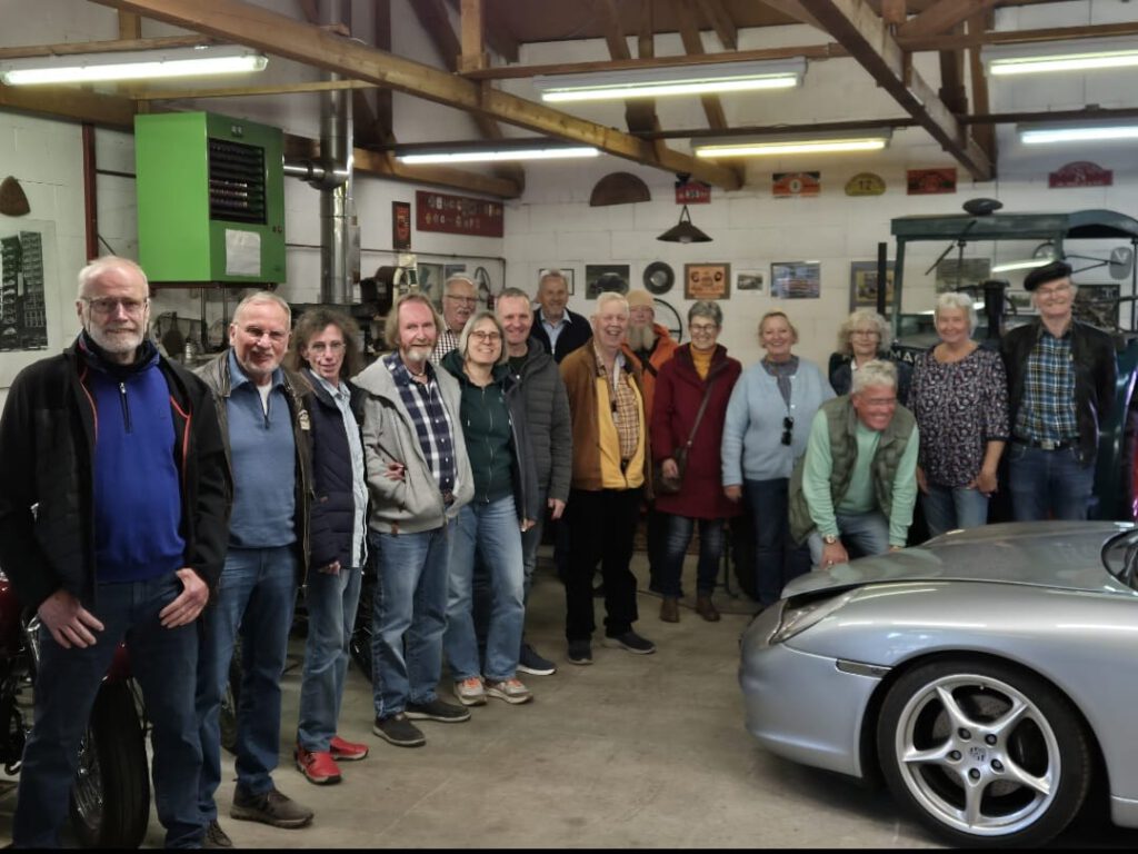 Nach der Besichtigung der Mühle und des Mühlenmuseums ging es über Land zum Mooriemer Landcafé in Elsfleth, dem eigentlichen Ziel des Ausflugs. Vor einer großen „Kuchenschlacht“ wurde auf einem Parkplatz ein Gruppenfoto gemacht. Auf dem Rückweg besichtigen noch einige Teilnehmer ein privates Oldtimer-Museum.