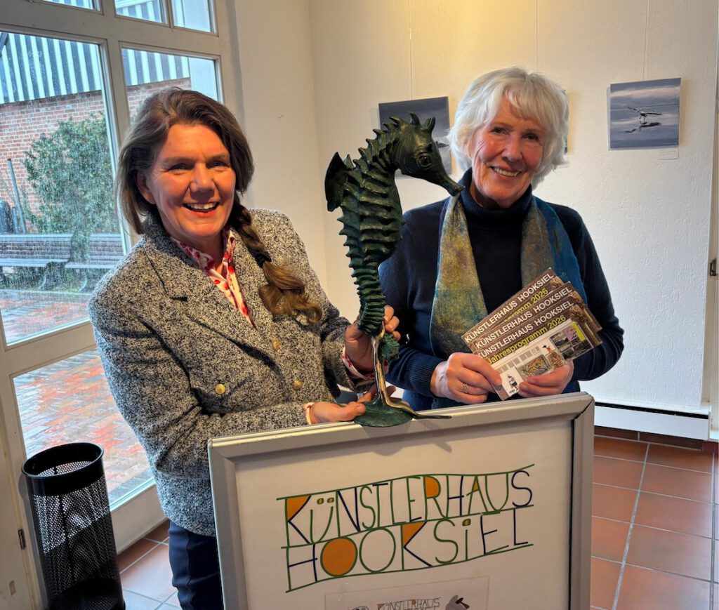 Spannend auch die Seepferdchen-Bronzen (auf dem Bild mit der Künstlerin und Künstlerhaus-Leiterin Renate Janßen-Niemann). Der „Hippocampus“ galt lange als ausgestorben – hat aber überlebt. Für seine Existenz benötigt das in mehrfacher Hinsicht bemerkenswerte Tier Salzwiesen, wie sie im Wattenmeer vorkommen. Übrigens: Bei den Seepferdchen tragen die ihren Weibchen stets treuen Männchen den Nachwuchs aus. Ihr nach außen gerichtetes Skelett ist extrem stabil und gilt als Vorbild für moderne Robo-Technik.