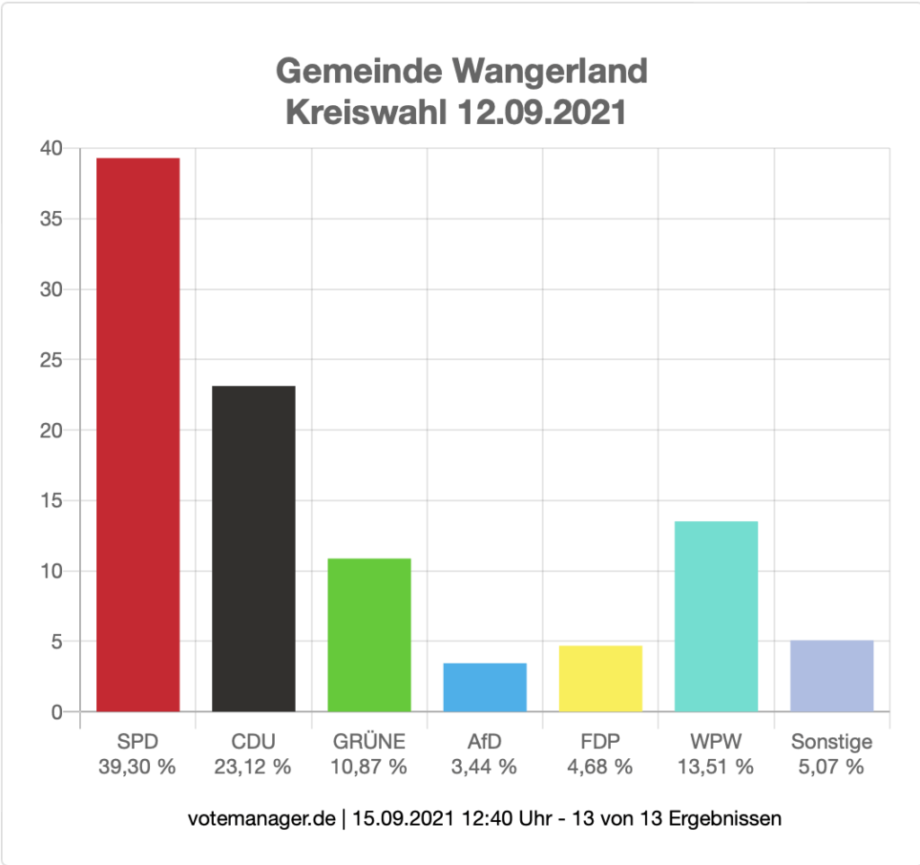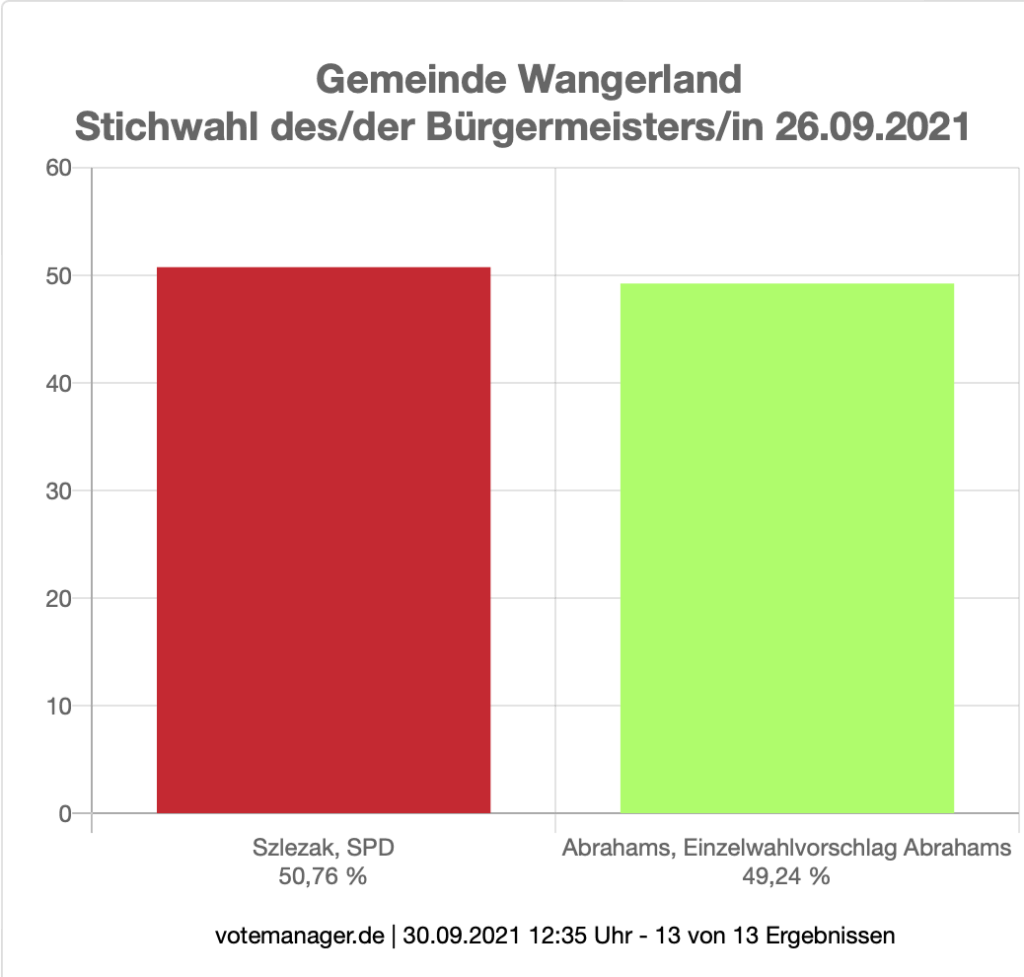 Im Wangerland wurde ein neuer Bürgermeister als Nachfolger von Björn Mühlena (SPD) und ein neuer Gemeinderat gewählt. Um das Bürgermeisteramt bewarben sich mit Mario Szlezak (SPD), Jens Damm (CDU), Bernd Abrahams (Einzelbewerber) und Peter Podein (Einzelbewerber) vier Kandidaten. In der erforderlichen Stichwahl am 26. September setzte sich Szlezak (50,8 %) gegen Bernd Abrahams (49,2 %) durch.