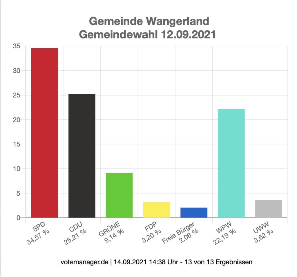 Die Gemeinderatswahl gewann die SPD mit 34,6 Prozent der Stimmen (8 Sitze) vor der CDU (25,2% / 6 Stimmen) und der Wählergemeinschaft Pro Wangerland (22,2 % / 5 Sitze). Auf den Plätzen folgten die Grünen (9,1 % / 2 Sitz) und mit jeweils einem Sitz UWW, FDP und Freie Bürger. Einen weiteren Sitz im Rat hat Bürgermeister Szlezak. Aktuell bilden SPD und Unabhängige (WPW/UWW) im Rat eine Gruppe, der die Gruppe „Gemeinsam fürs Wangerland“ (GfW) mit CDU, Grüne, FDP und Nadine Kirschner gegenübersteht.