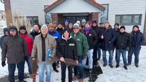 Hooksiel (4. 7. 2023) – Großer Auflauf am Hohe Weg: Das neue Feuerwehrgerätehaus in Hooksiel ist heute Nachmittag gerichtet worden. Polier Alexander Wilken sprach vor gut Hundert Feuerwehrleuten, Nachbarn und Gästen aus dem Ort den traditionellen Richtspruch.