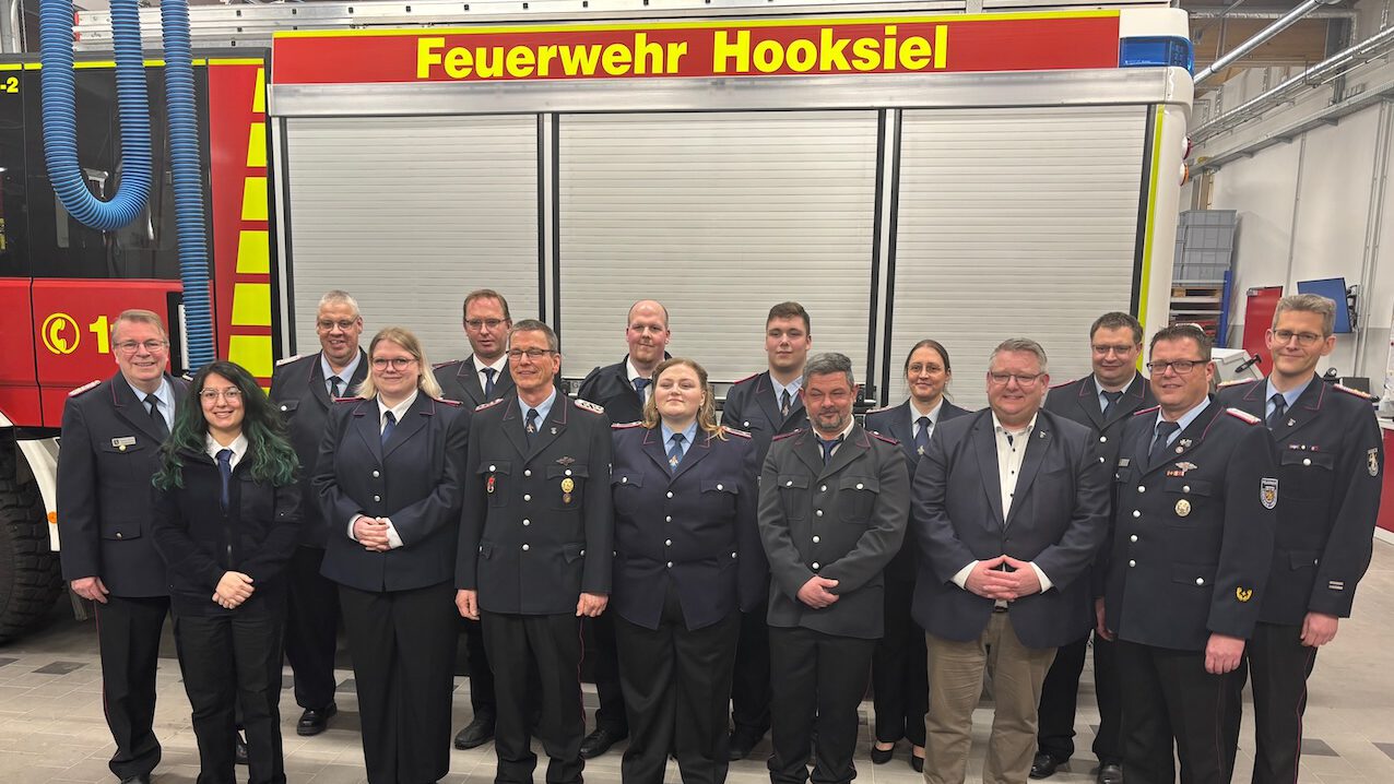 Der stellvertretende Gemeindebrandmeister Florian Harms beförderte Ausbildungsleiterin Marianne Kruse zur Löschmeisterin. Sie damit die erste Frau, die in Hooksiel diesen Rang erreicht hat. Der stellvertretende Ortsbrandmeister Thomas Große darf sich seit Samstag die Brandmeister-Schulterklappen tragen. Zudem wurden Celine Heidemann zur Feuerwehrfrau und Damian Priebe zum Feuerwehrmann ernannt. Kreisbrandmeister Heuer berief zudem Dr. Große zum Feuerwehrarzt des Landkreises Friesland.