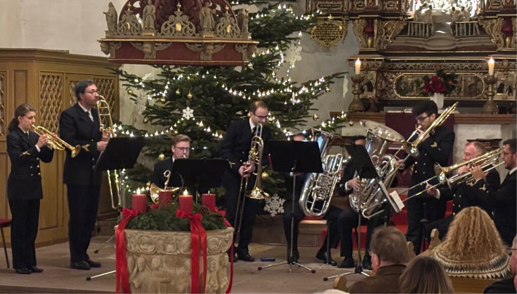 Das Benefiz-Konzert wurde nach 2024 jetzt zum zweiten Mal nach der Neugründung des Musikkorps angeboten. Anderthalb Stunden lang verwöhnten ein Posaunenensemble und ein Blechbläserquintett der Militärmusiker die Ohren der Zuhörerinnen und Zuhörer, die sich mit stehendem Applaus bedankten. Zum Abschluss des Konzerts gaben beide Formationen das Weihnachtslied „Macht hoch die Tür“ zum Besten – und natürlich sang das Publikum mit.